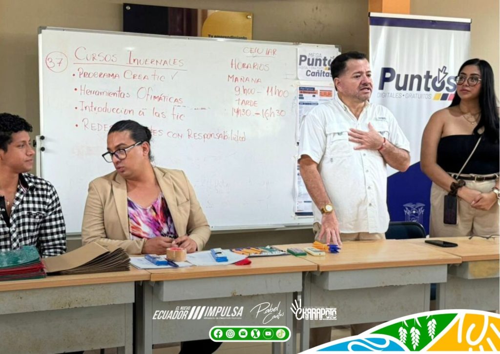 El Ing. Pabel Cantos Centeno, presidente del GAD Parroquial de Charapotó, en compañía de la vicepresidenta Lcda. Madelaine Salazar, brindaron la bienvenida a los participantes de los cursos que se desarrollan en el Mega Punto Digital Gratuito Cañitas, reafirmando su compromiso con la inclusión digital y el fortalecimiento de las capacidades tecnológicas de la comunidad.